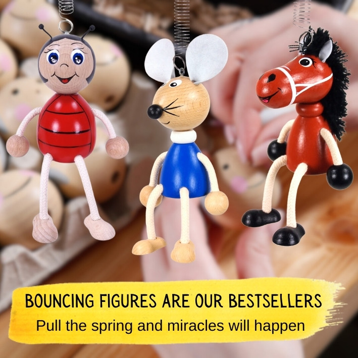 I am a ladybird, a bouncing wooden figure, handmade and hand painted. I have movable hands and legs and I can also sit. Pull the spring and I will jump up and down. Handmade and...